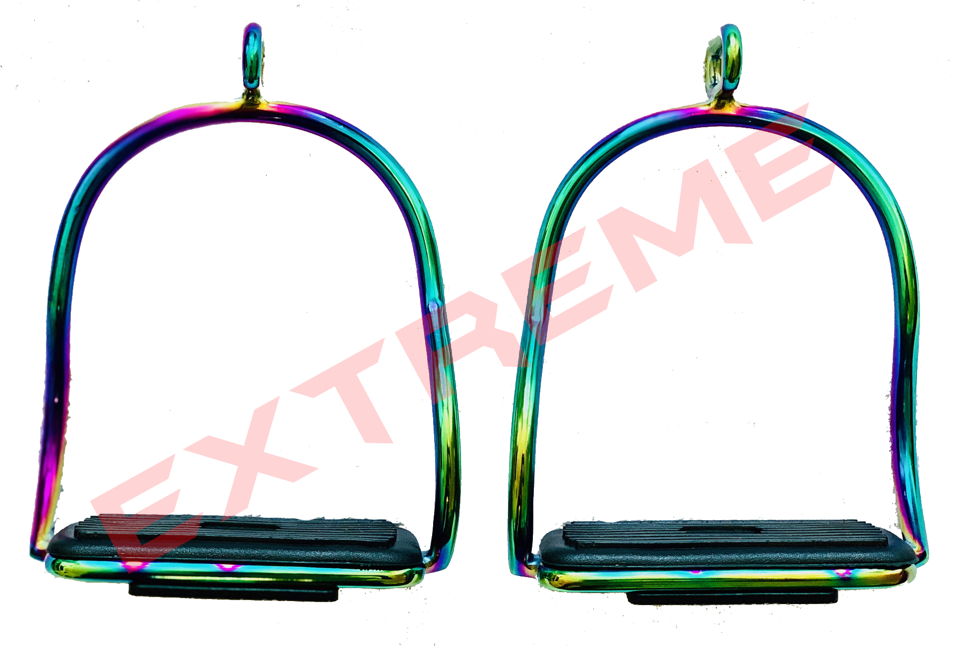 Rainbow Gloss Double Bend Stirrups with easy to hop on Black Treads have double bend that enable a better foot grip and ensure greater safety. Double Bend Stirrups are more comfortable than regular stirrups and provide optimum comfort and better leg positioning. These Unisex, Rust-resistant and Durable Stirrups are a perfect fit for all. Available in sizes 4″ & 4.75″.